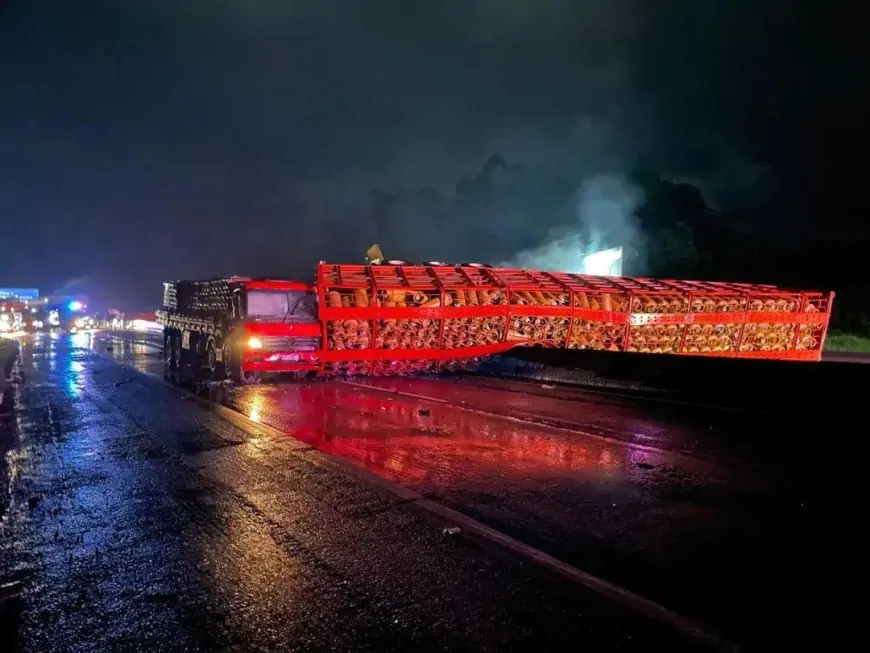 TOMBAMENTO DE CAMINHÃO CARREGADO COM BOTIJÕES DE GÁS INTERDITA BR-101 EM JOINVILLE Na madrugada desta quinta-feira (02), por volta das 3h30, um caminhão que transportava botijões de gás vazios tombou no km 48 da BR-101, sentido sul, em Joinville. De acordo com informações, o veículo atingiu a mureta central da rodovia, um radar e ainda colidiu com outros dois caminhões. O motorista do caminhão de botijões sofreu apenas lesões leves e recebeu atendimento médico. A concessionária Arteris permanece no local realizando os trabalhos de retirada dos veículos e destroços. Até o momento, não há previsão de liberação da pista. A situação é agravada pelo fato de não existir via marginal no trecho, o que intensifica os reflexos no tráfego. As autoridades orientam motoristas a redobrar a atenção e, se possível, buscar rotas alternativas. (Atento a Rede com informações PRF) INFORMOU EQUIPE ATENTO A REDE